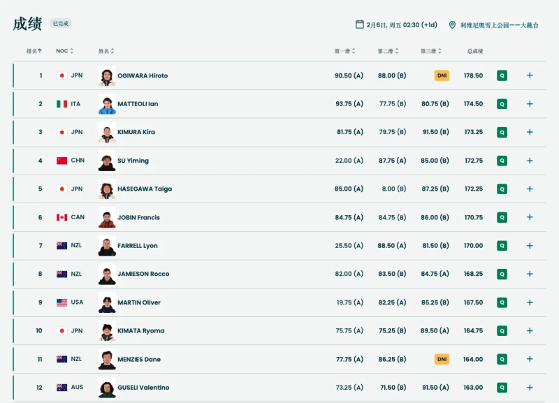 在北京时间2月6日结束的米兰冬奥会单板滑雪男子大跳台预赛中,卫冕冠军、中国选手苏翊鸣以总分172.75分的成绩,排名预赛第4位,成功晋级本届冬奥会单板滑雪大跳台决赛。